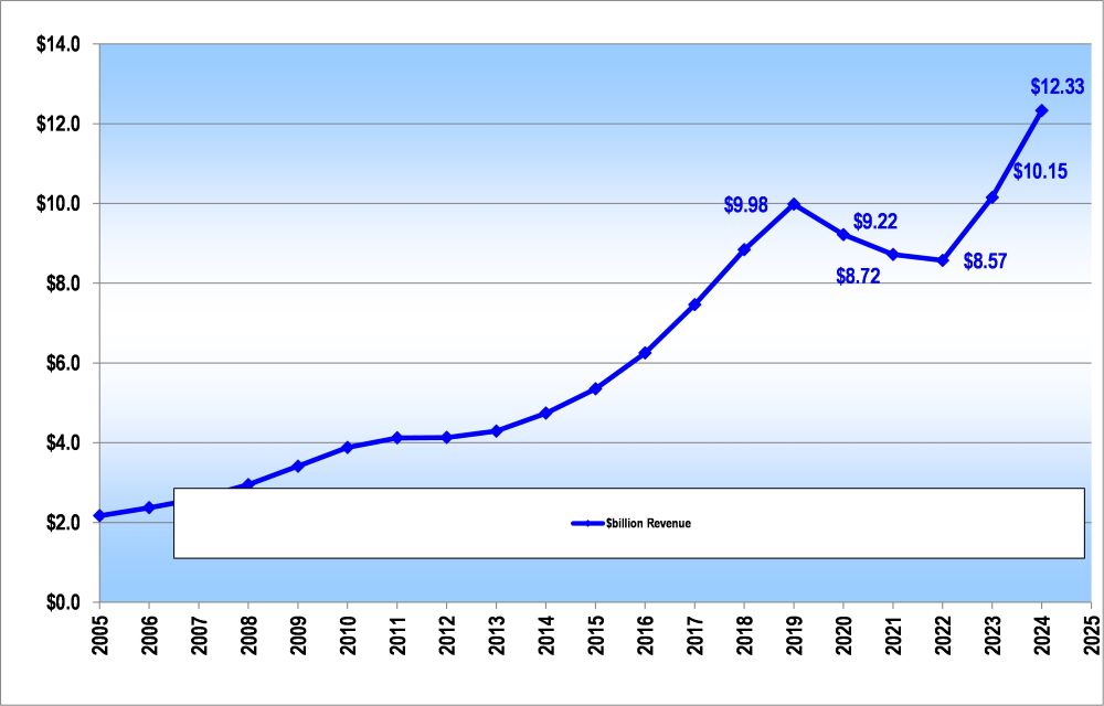 In the first perfect storm, revenue from international student fees was flat at $3.88 billion in 2010, $4.12 billion in 2011, $4.13 billion in 2012 and $4.29 billion in 2013, then grew to $7.46 billion in 2017, $8.84 billion in 2018 and $9.98 billion in 2019, before the second perfect storm saw a drop to $9.22 billion in 2020, $8.72 billion in 2021, and $8.57 billion in 2022, then $10.15 billion in 2023 and $12.33 billion in 2024.
