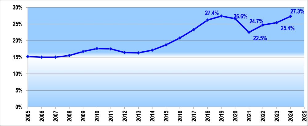 In the first perfect storm, the proportion was flat at 17.6% in 2010 and 17.5% in 2011, then dropped to 16.4% in 2012 and 16.3% in 2013, then grew to 23.3% in 2017, 26.2% in 2018 and 27.4% in 2019, before the second perfect storm saw a drop to 26.6% in 2020 and 22.5% in 2021, then 24.7% in 2022, 25.4% in 2023 and 27.3% in 2024.