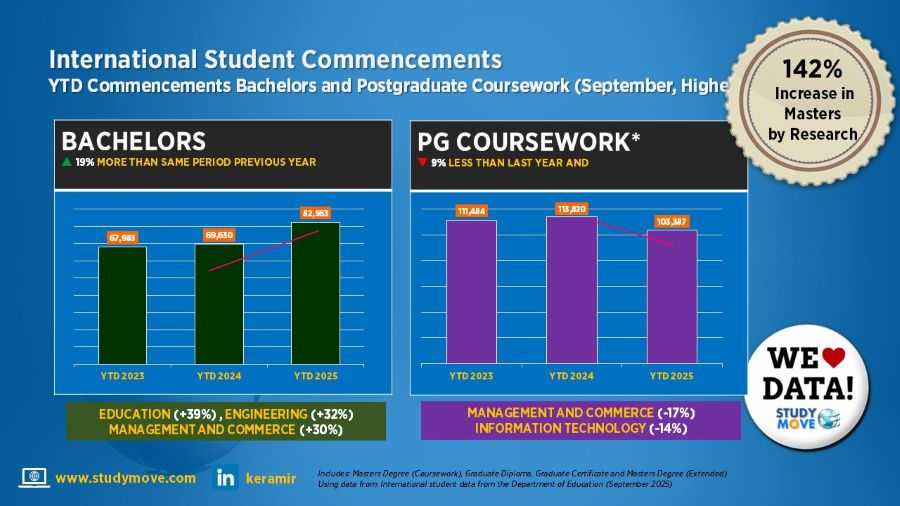Presenting final commencement estimates for 2025, Studymove managing director Keri Ramirez said international higher education commencements were expected to increase by around 1 per cent year on year, effectively unchanged in volume, but notable given the cumulative impact of visa reform, ministerial direction and integrity measures introduced since 2023.